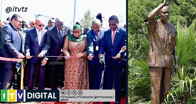 Rais wa Jamhuri ya Muungano wa Tanzania, Mhe. Samia Suluhu Hassan, akiwa ameshika utepe pamoja na viongozi mbalimbali, wakati Rais wa Zambia Hakainde Hichilema, akikata utepe huo kuashiria uzinduzi wa Sanamu ya Baba wa Taifa, Mwalimu Julius Kambarage Nyerere, katika Makao Makuu ya Umoja wa Afrika (AU), Addis Ababa nchini Ethiopia leo Februari 18, 2024.