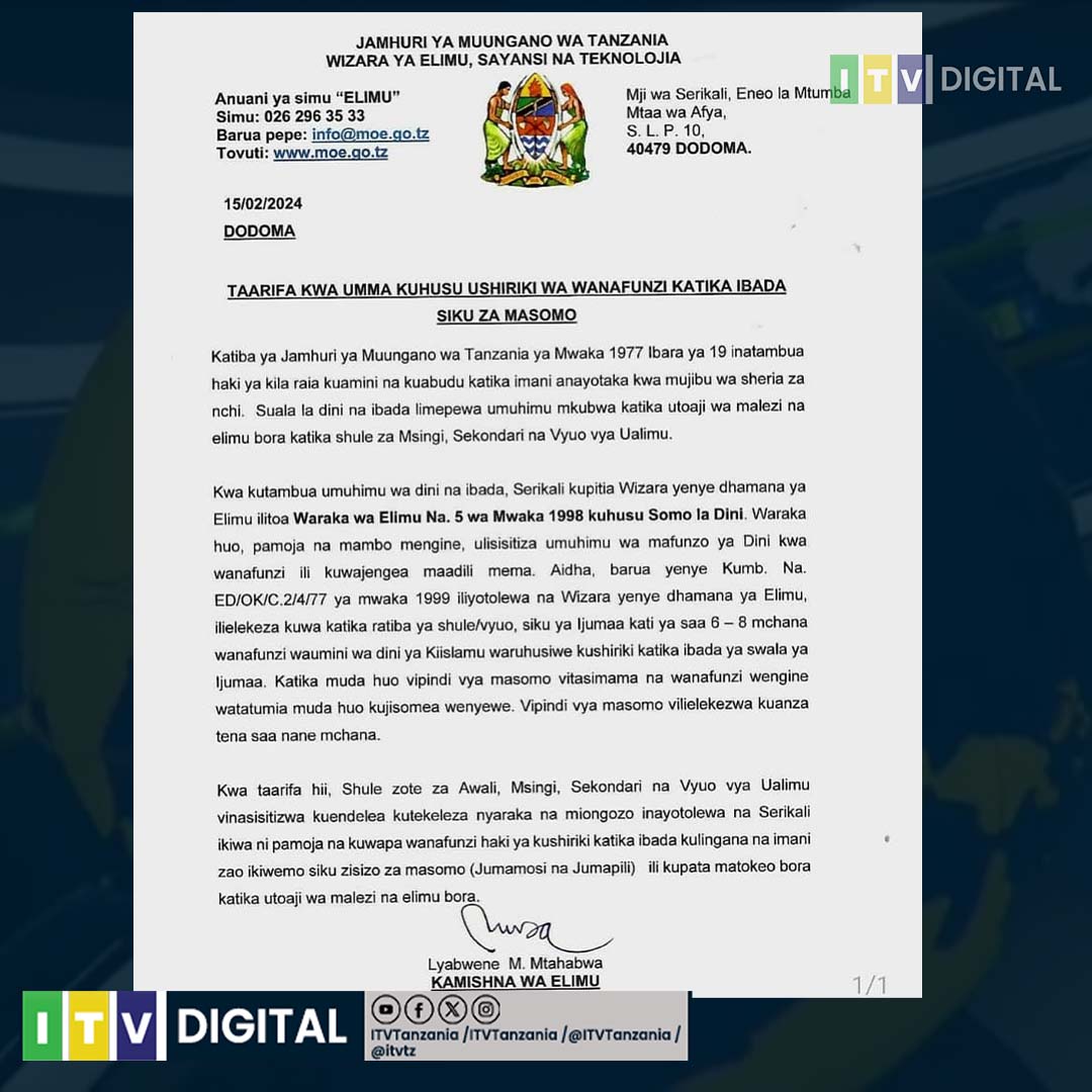 Serikali imezitaka Shule zote za Awali, Msingi, Sekondari na Vyuo vya Ualimu, kuendelea kutekeleza nyaraka na miongozo inayotolewa na Serikali, ikiwa ni pamoja na kuwapa wanafunzi haki ya kushiriki katika ibada kulingana imani zao, ili kupata matokeo bora katika utoaji wa malezi na elimu bora.